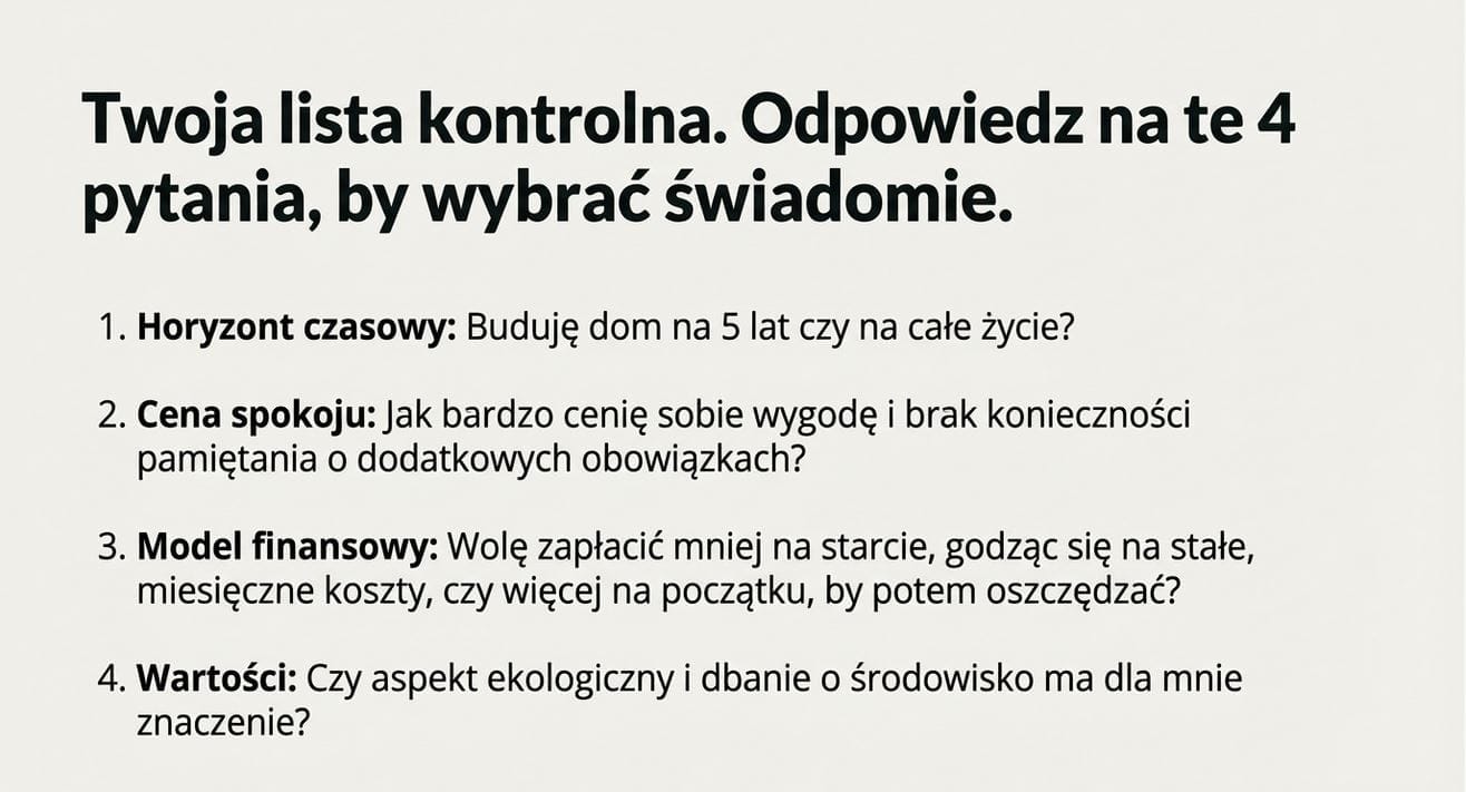 W kolejnych poradnikach przejdziemy przez te tematy szczegółowo, pokazując, jak uniknąć najczęstszych błędów i jak zaplanować inwestycję w sposób, który nie zaskoczy Cię w trakcie budowy ani po zamieszkaniu w domu.