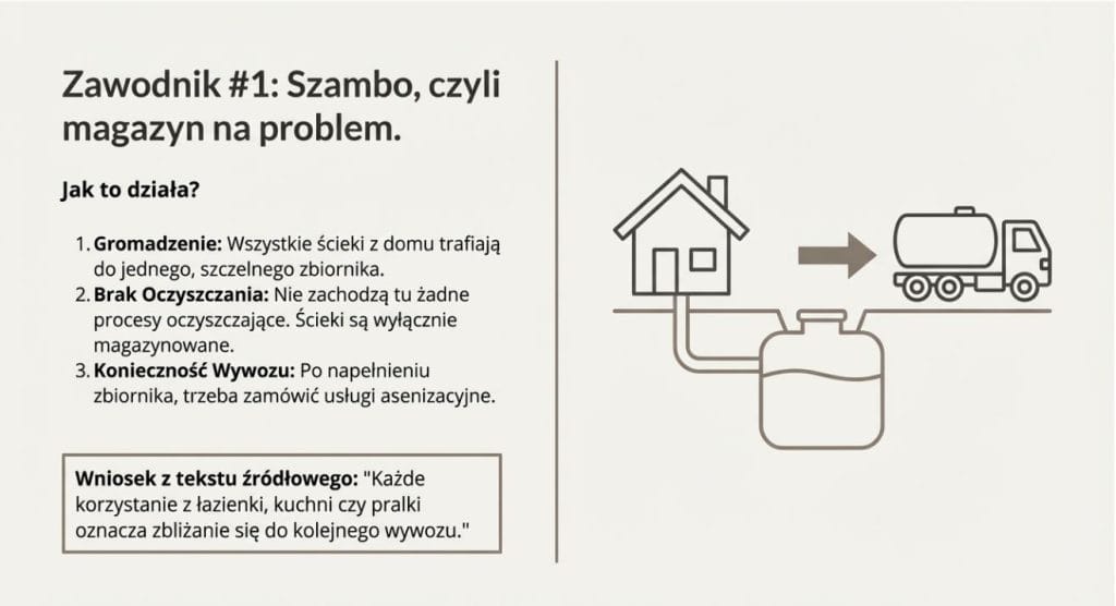 Problem w tym, że prostota kończy się w momencie zamieszkania. Szambo to stałe koszty wywozu, zależność od dostępności wozu asenizacyjnego i ryzyko przepełnienia. Przy większej rodzinie lub intensywnym użytkowaniu domu rachunki potrafią bardzo szybko przewyższyć koszt inwestycji w oczyszczalnię.