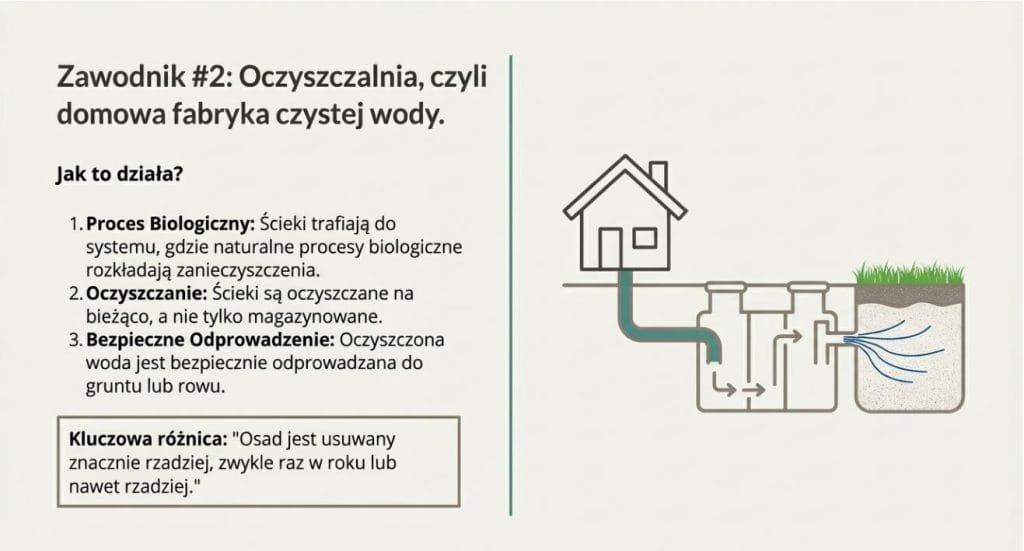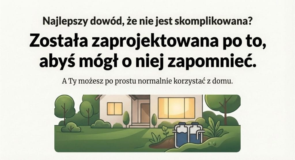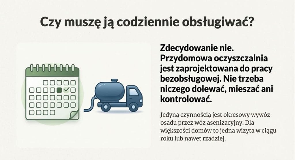 W rzeczywistości nowoczesne oczyszczalnie są projektowane jako systemy działające w tle. Użytkownik nie musi niczego regulować ani pilnować na co dzień. Jedyną regularną czynnością jest okresowy wywóz osadu, który dla większości domów odbywa się raz w roku lub nawet rzadziej.