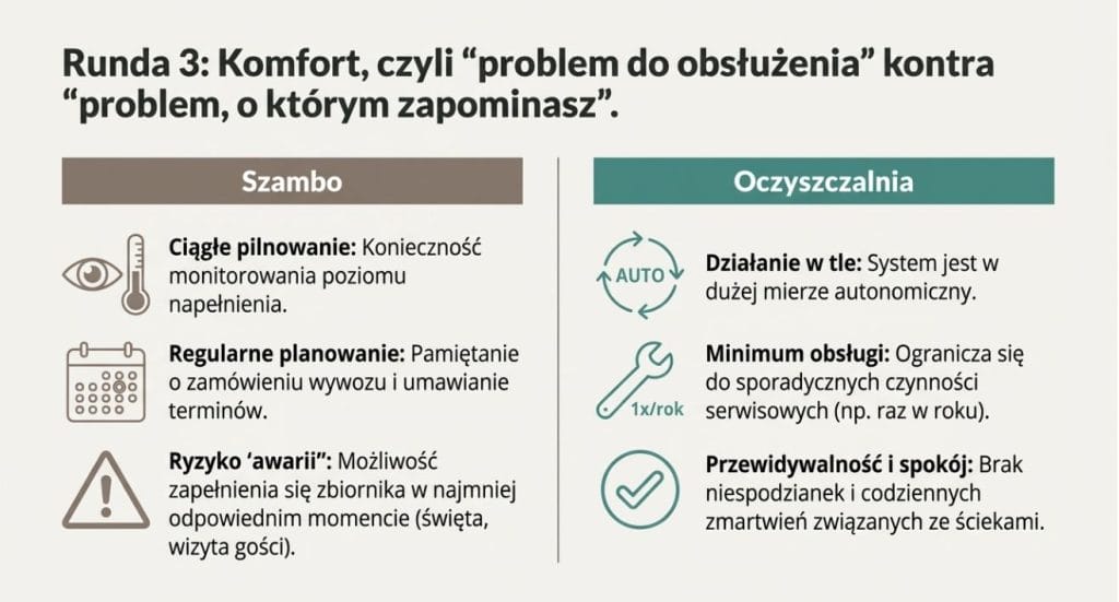 Dla osób, które przesiadły się z szamba na oczyszczalnię, różnica w komforcie jest zwykle bardzo wyraźna.