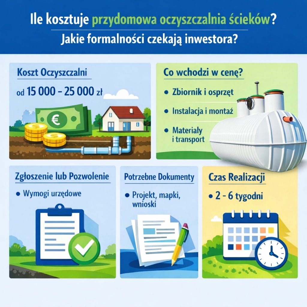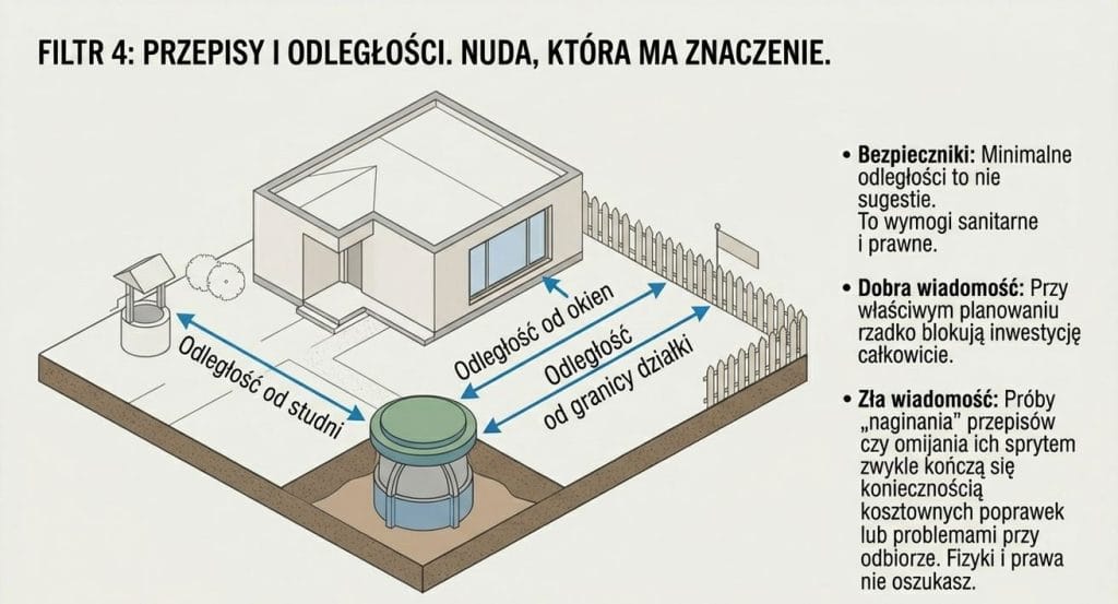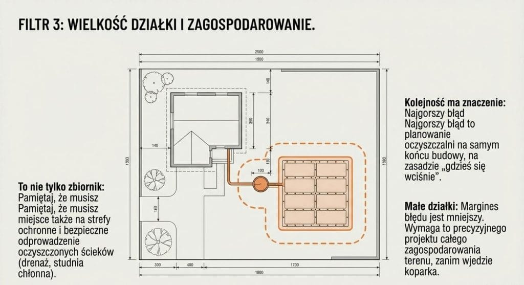 Kolejny element to powierzchnia parceli i to, co już się na niej znajduje. Oczyszczalnia to nie tylko zbiornik. To także strefy ochronne, wymagane odległości i miejsce na bezpieczne odprowadzenie oczyszczonych ścieków.