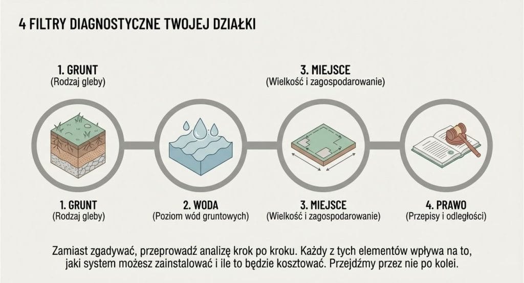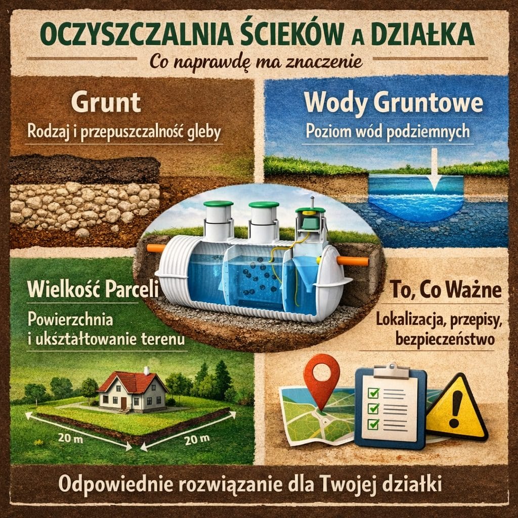 Znaczenie ma rodzaj gruntu, poziom wód gruntowych, wielkość parceli i lokalne przepisy. Działka piaszczysta daje inne możliwości niż gliniasta, a wysoki poziom wód gruntowych wymusza inne rozwiązania niż suchy teren.