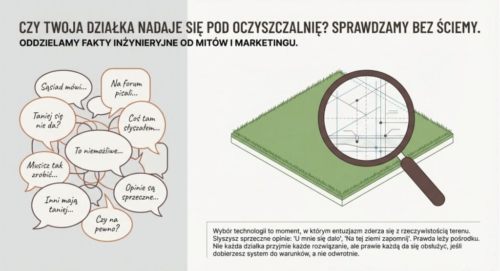 mogą wykluczać część rozwiązań lub wymagać dodatkowych elementów (np. przepompowni). Bez tej analizy wybór oczyszczalni jest jak wybór opon bez sprawdzenia rodzaju samochodu.
