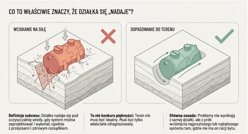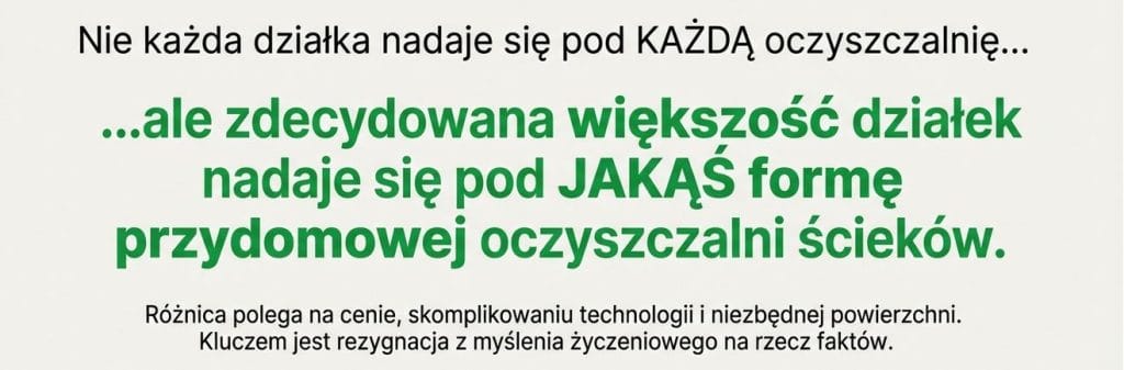 Uczciwa odpowiedź brzmi: nie każda działka nadaje się pod każdą oczyszczalnię, ale zdecydowana większość działek nadaje się pod jakąś formę przydomowej oczyszczalni ścieków.