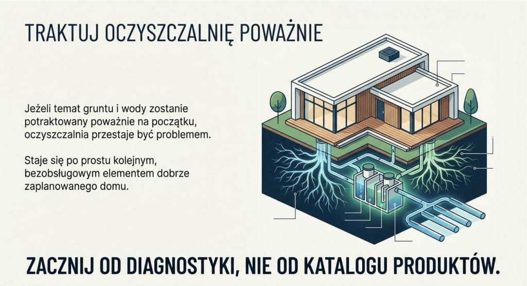 Jeżeli temat działki zostanie potraktowany poważnie na początku, oczyszczalnia przestaje być problemem, a staje się po prostu kolejnym elementem dobrze zaplanowanego domu.
