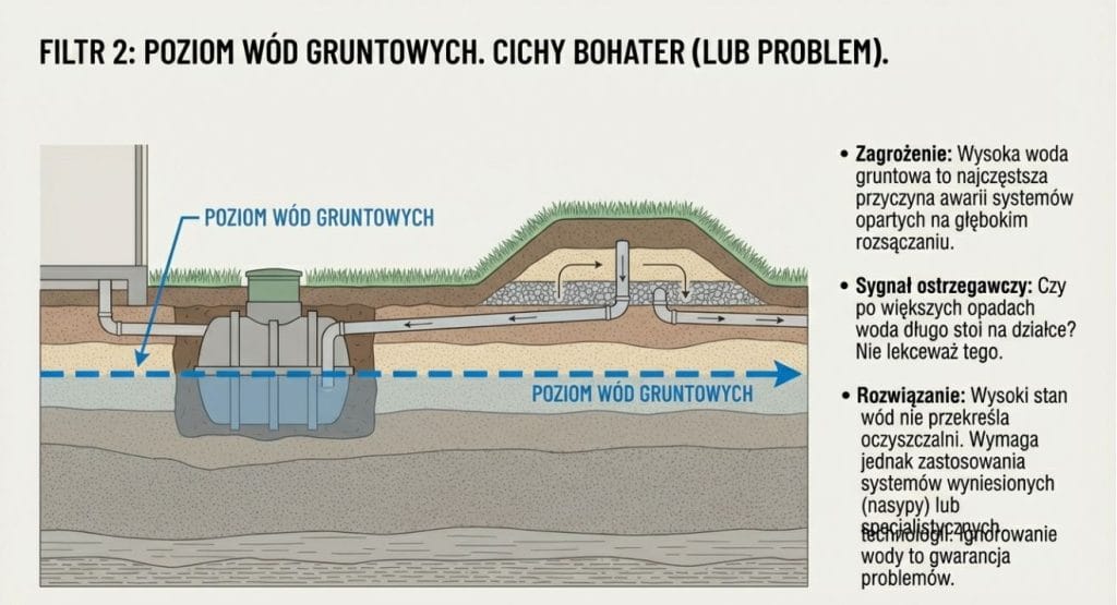 Druga sprawa to poziom wód gruntowych. Wysoka woda potrafi skutecznie ograniczyć wybór, zwłaszcza jeśli ktoś planuje systemy wymagające głębokiego rozsączania.