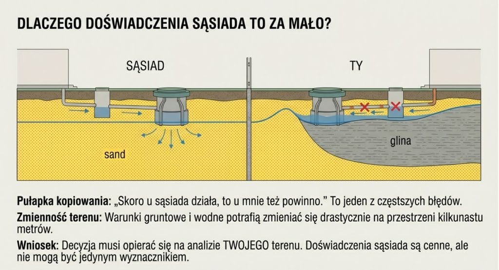 Działki obok siebie nie muszą mieć identycznych warunków. Dlatego decyzja powinna opierać się na analizie własnego terenu, a nie na cudzych doświadczeniach.