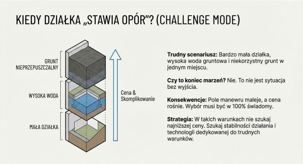 Są sytuacje, w których pole manewru jest niewielkie. Bardzo mała działka, wysoka woda gruntowa i niekorzystny grunt w jednym miejscu to zestaw, który wymaga szczególnej uwagi.