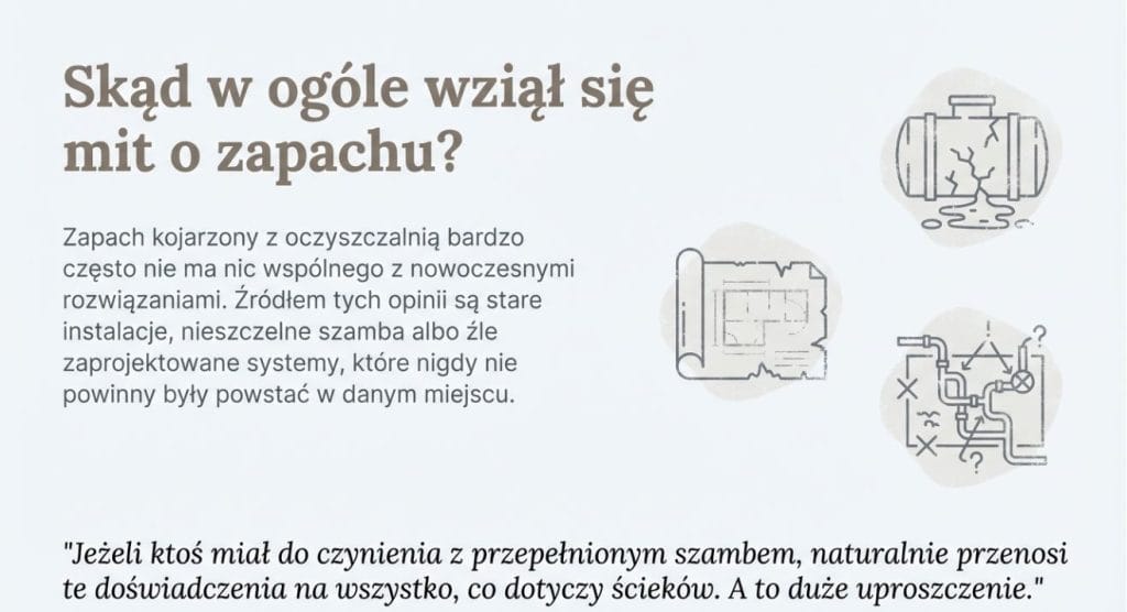 Jeżeli ktoś miał do czynienia z przepełnionym zbiornikiem bezodpływowym albo prowizorycznym układem sprzed lat, naturalnie przenosi te doświadczenia na wszystko, co dotyczy ścieków. A to duże uproszczenie.