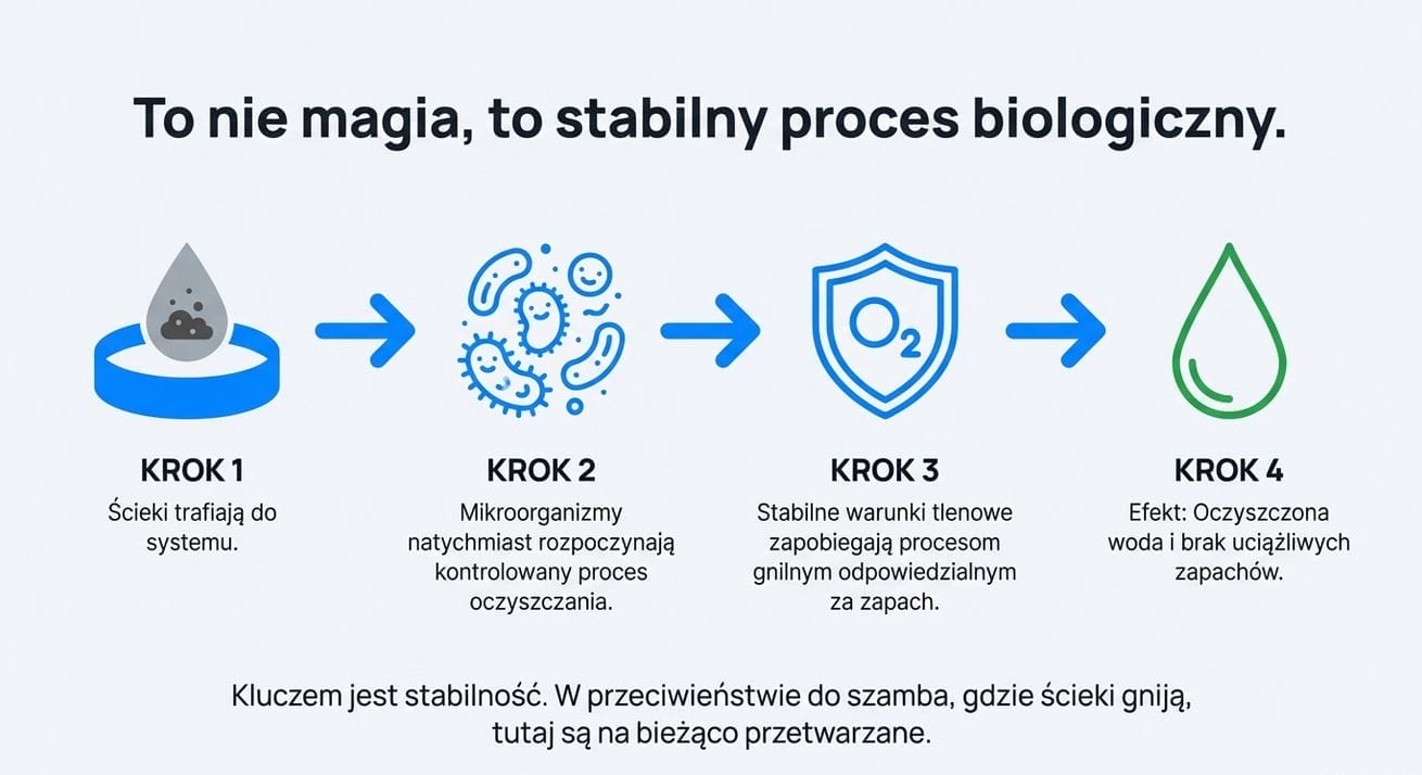 Ścieki nie gniją w zbiorniku w taki sposób, jak w szambie. Są na bieżąco oczyszczane przez mikroorganizmy, które do tego potrzebują stabilnych warunków. To właśnie ta stabilność sprawia, że nie dochodzi do powstawania intensywnych zapachów.