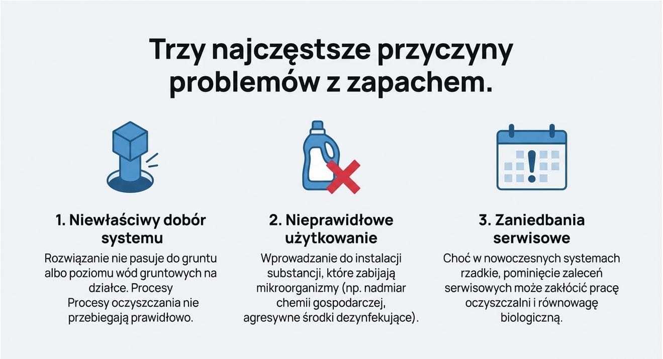 Jedną z nich jest niewłaściwy dobór systemu do warunków działki. Jeżeli rozwiązanie nie pasuje do gruntu albo poziomu wód gruntowych, procesy oczyszczania mogą nie przebiegać prawidłowo.