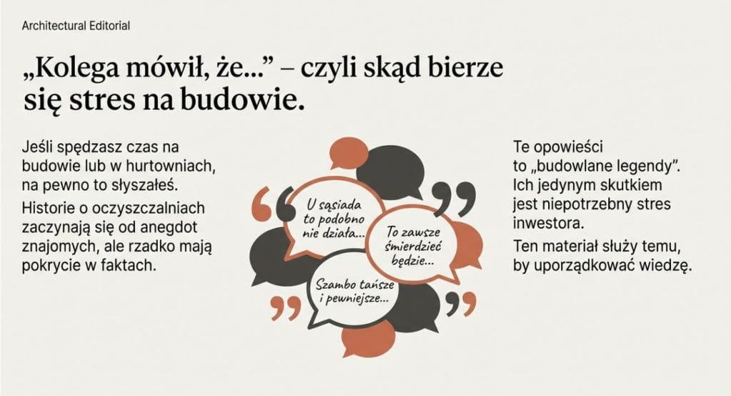 Ten tekst porządkuje najczęściej powtarzane mity. Nie po to, żeby kogokolwiek przekonywać, ale żeby oddzielić fakty od budowlanych legend, które potrafią skutecznie wywołać niepotrzebny stres.