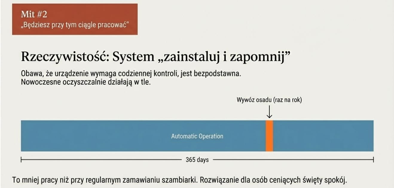 Wielu inwestorów wyobraża sobie oczyszczalnię jako urządzenie, które trzeba codziennie kontrolować, doglądać i obsługiwać. To myślenie zniechęca szczególnie osoby, które chcą mieć po prostu święty spokój.