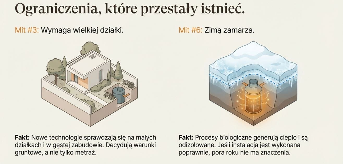 Obecnie dostępne są rozwiązania, które sprawdzają się także na niewielkich działkach i w gęstej zabudowie. Oczywiście wielkość parceli ma znaczenie, ale nie jest jedynym czynnikiem decydującym. Dużo ważniejsze są warunki gruntowe i sposób odprowadzania oczyszczonych ścieków.
