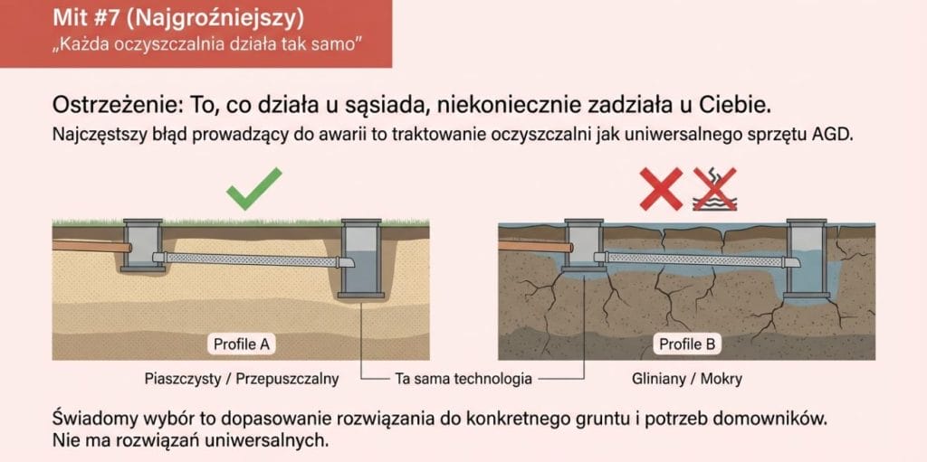 To jeden z bardziej niebezpiecznych mitów, bo prowadzi do wyboru przypadkowego rozwiązania. Różnice pomiędzy technologiami, sposobem odprowadzania ścieków i wymaganiami wobec działki są bardzo istotne.