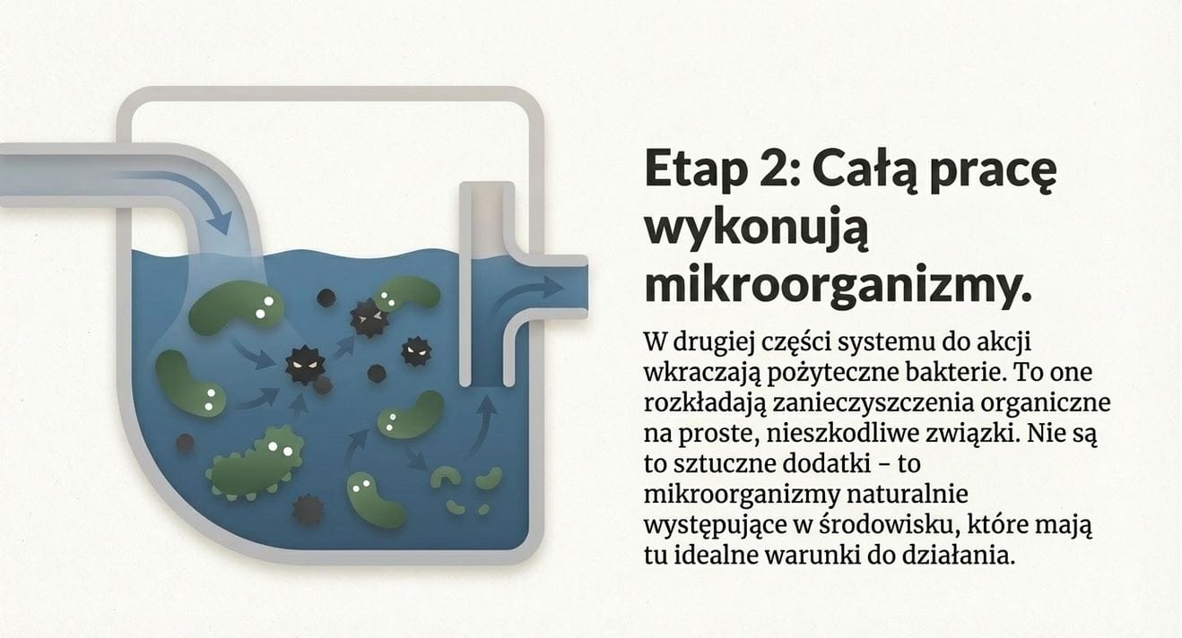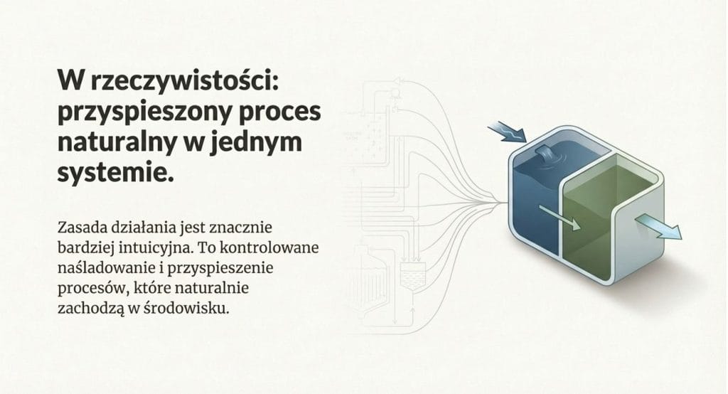 Choć nazwa może brzmieć technicznie, zasada działania jest dość logiczna. Ścieki z domu trafiają do pierwszego zbiornika, gdzie oddzielane są grubsze zanieczyszczenia. Następnie przechodzą przez etap biologicznego oczyszczania, w którym mikroorganizmy rozkładają związki organiczne.