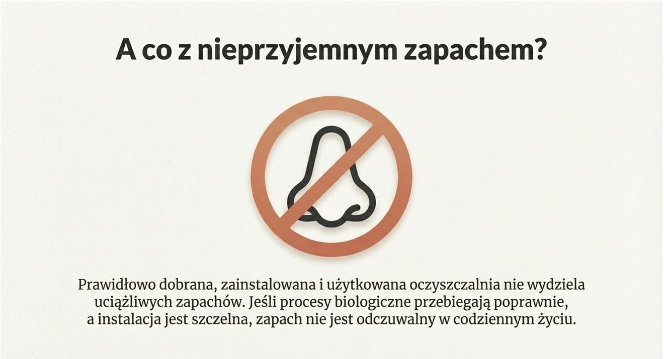 Jeżeli temat zapachu jest dla Ciebie jedną z głównych barier, to dobra wiadomość. W nowoczesnych przydomowych oczyszczalniach to problem, który w praktyce po prostu nie powinien się pojawić.